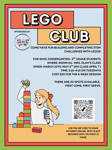If you are in Kindergarten through 3rd Grade and love to build, come join Mrs Olah every Tuesday from 3.15 to 4.15.
